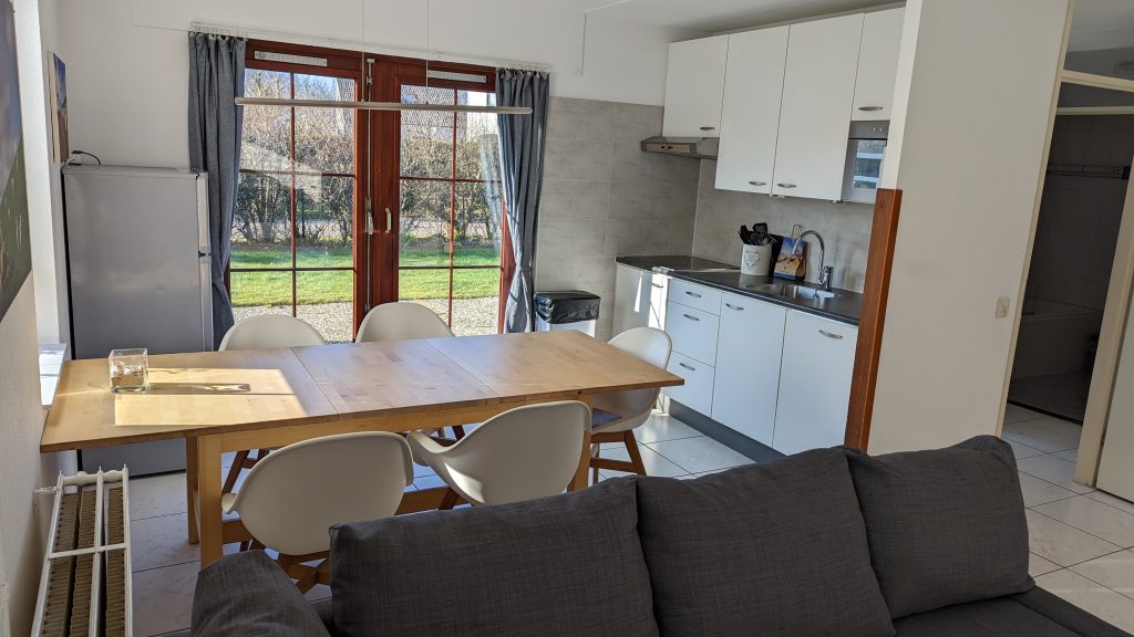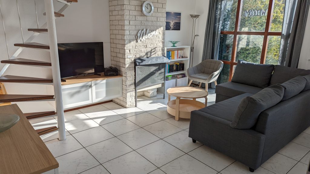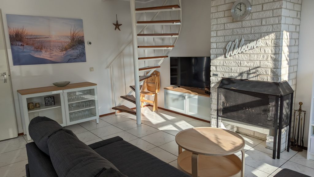 Zudem erreicht man über den Flur den schönen Wohnbereich mit einem offenen Kamin und gemütlicher Sitzlandschaft. Flachbildfernseher (deutsche und holländische Programme), Blueray-Player und CD-Radio sind vorhanden. Zudem gibt es einen kleinen Vorrat an Büchern (deutsch) im Vitrinenschrank.