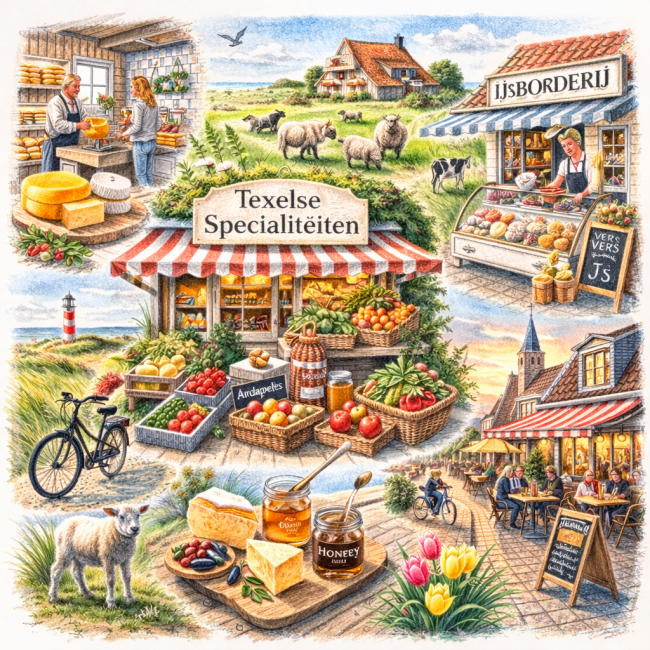 Texel schmeckt man am besten direkt beim Erzeuger. Besuchen Sie die Kaasboerderij Wezenspyk für preisgekrönten Schafs- und Ziegenkäse oder die IJsboerderij Labora bei De Cocksdorp für das wohl beste Eis der Insel, hergestellt aus Milch der eigenen Kühe. In den vielen kleinen Hofläden (z.B. Novalishoeve) finden Sie zudem frisches Obst, Lammfleisch und die berühmten Texeler…